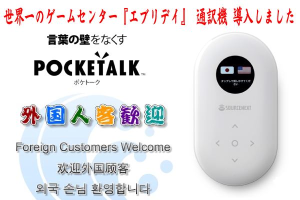 株式会社東洋(埼玉県北本市/代表取締役 中村秀夫) が経営する、1店舗当たりのクレーンゲーム設置台数が240台で2012年3月3日にギネス世界記録に認定されている 「世界一のゲームセンター エブリデイ行田店(埼玉県行田市)」は、2018年3月15日(木)から、日本政府の推進するクールジャパン戦略の『インバウンド』対策の一環として、外国人顧客との接客時コミュニケーションをより快適に、安心して楽しんで頂くためのツールとして、ソースネクスト株式会社より発売されている通訳機「POCKETALK(ポケトーク)」を導入致しました。