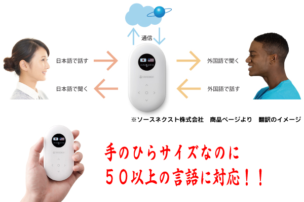 ソースネクスト株式会社より発売されている通訳機「POCKETALK(ポケトーク)」は、 50以上の言語の中から任意の2言語を選んで、話しかけるだけで、そこにまるで本物の通訳がいるかのように双方向コミュニケーションが取れる、手のひらサイズの先進のIoT通訳機です。