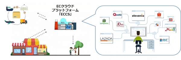 EASG独自開発の統合型ECクラウドプラットフォーム「ECCS(Enterprise Commerce Cloud Service)」は、自社のECサイトや、Tokopedia、Shoppee、Bukalapak、Lazada、Blibliなど、インドネシアをはじめとするASEANの主要ECモール内の自社EC店舗、さらには自社リアル店舗の運用を一元管理できるサービスです。