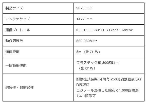 2.小型の物流容器にも貼付可能な28×83mmサイズで、8mの長距離通信を実現。標準仕様のほかにも利用用途に応じたカスタマイズが可能。