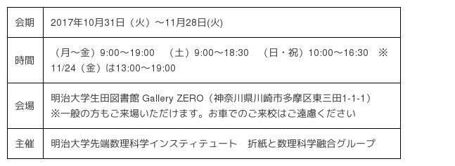 明治大学生田キャンパス(神奈川県川崎市多摩区)の生田図書館 Gallery ZEROでは、10月31日(火)~11月28日(火)に『折紙工学の今 ― 折紙工学と折紙式プリンターで産業イノベーションを!』を開催します。