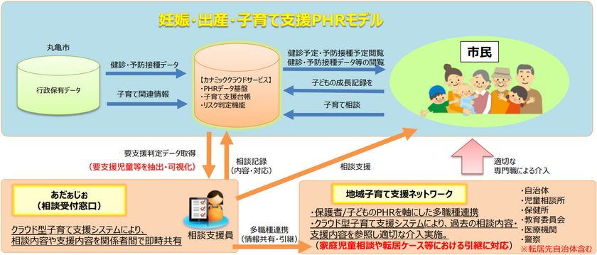総務省が実施する「地域IoT実装推進事業」の一環として、行政保有データを活用した要支援児童等への適切な介入ならびに市民と行政とのコミュニケーションを活性化を図り、安全で安心な子育て環境をICTを活用したPHRモデルを展開する事業となります。